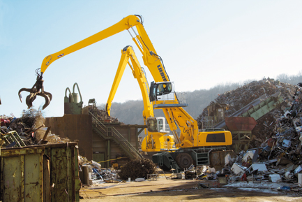 Na zdjęciach: koparki kołowe Liebherr LH 80 M Litronic wyposażone w chwytaki wielołupinowe pracujące przy przeładunku złomu